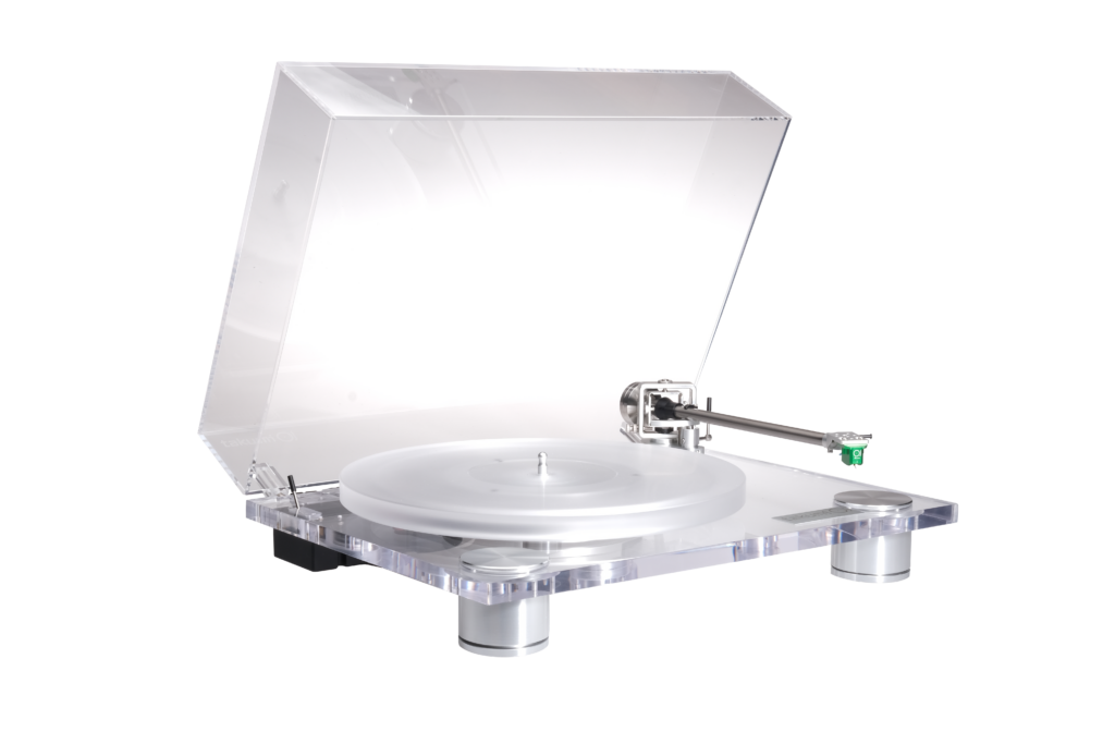 Giradischi con trazione a cinghia, motore DC controllato elettronicamente disaccoppiato dalla struttura portante, base e piatto in acrilico per il migliore controllo delle vibrazioni, piedini smorzanti regolabili, braccio con tubo in titanio, headshell integrata e cavo phono direttamente collegato ai cavi del braccio evitare molteplici connessioni extra che degradino la qualità.