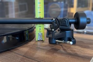 Misura la distanza dalla superficie di appoggio del Little Fwend (plinto/base braccio) fino al lato inferiore del braccio con la puntina abbassata a fine disco.